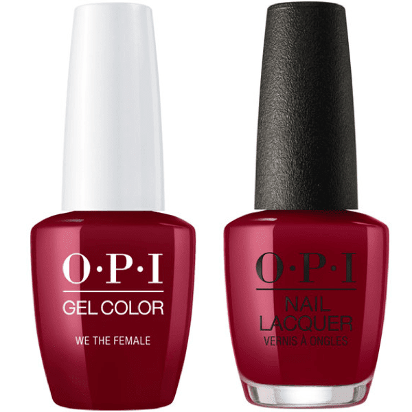OPI We the Female My Nail Polish Online Description Benefits How to use Ingredients A ravishing burgundy red which makes a statement. Look like a boss in this strong, stunning shade. Nail Lacquer is OPI's original nail polish formula. Use your nail polish shade with OPI Base Coat and OPI Top Coat for extended wear. Made in the USA.