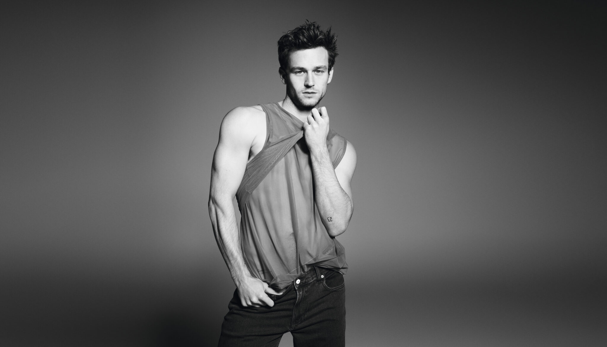 Video en foto’s Winq.nl Brandon Flynn dons a black tank and underwear for Calvin Klein's 2023 Pride campaign. Photo: Karim Sadli / Calvin Klein. Black-and-white portraits serve to accentuate Flynn's charm as well as his personal body art. Each tattoo tells a story: the barbed wire heart on his left chest reveals a hidden strength, while the "23" near his left.